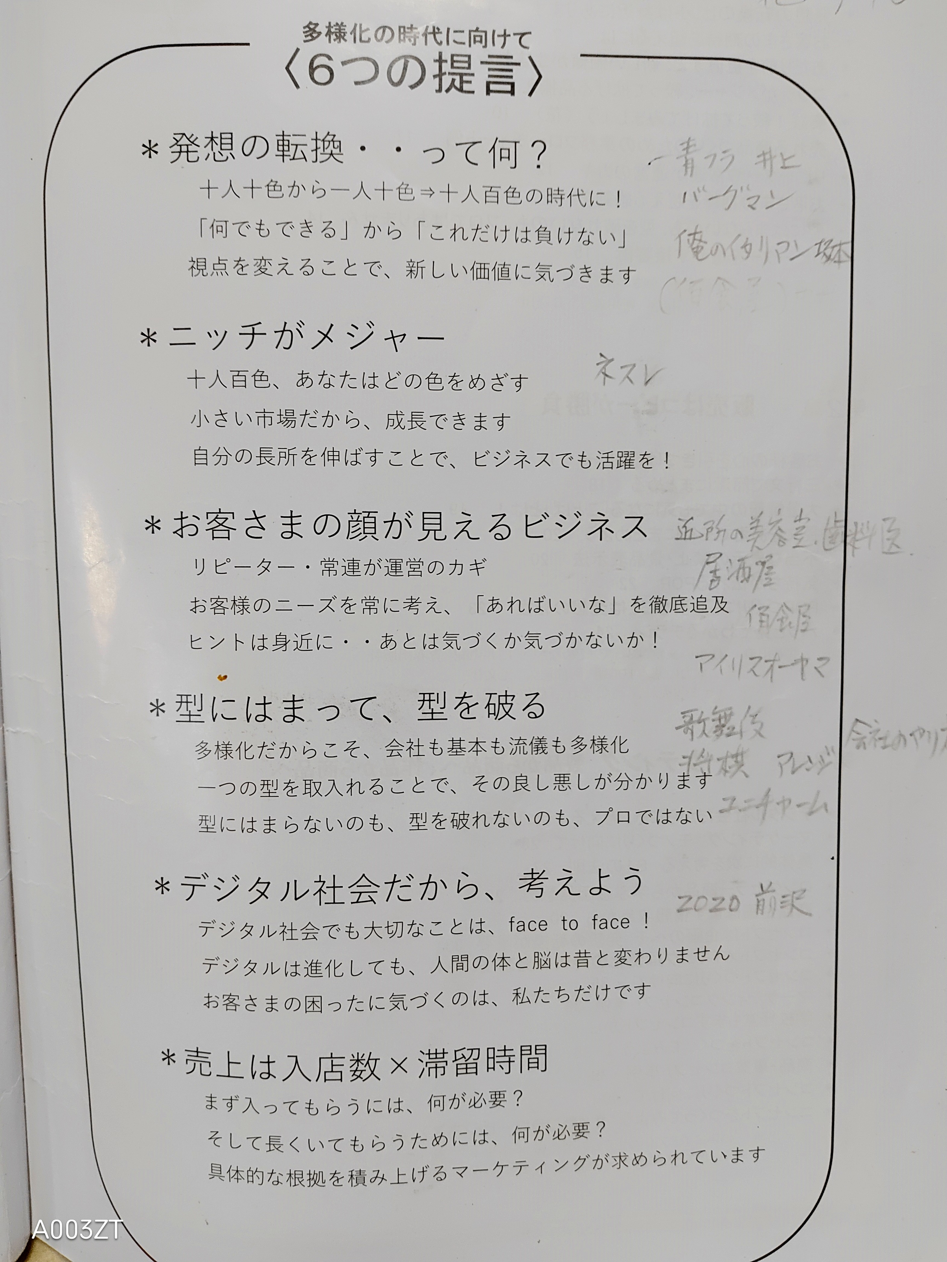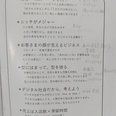 2024年9月 ハローワーク求職訓練講座 by Kaneko | posted in: WORKS | 0 9月は3月生の最終日・12回目で、数字を中心に売上・コスト・利益を集中して 在庫や販促などを実施。最後は半年の販促プランの長帳を班ごとに作成・発表! 実際の場所を確定して、ターゲットに沿ったプランづくりで締めました。 9月生は最所の講座で、ビジネスの基本や多様化時代における発想の転換やヒラメキ、 リピーターの重要性を具体的な実例や記事を提供して、業界や分野を超えて今必要な 横串ししてわかるキーワードを体感してもらいました。 今回は4カ月の講座ですので、販売・マーケティングは全8回で実施します。