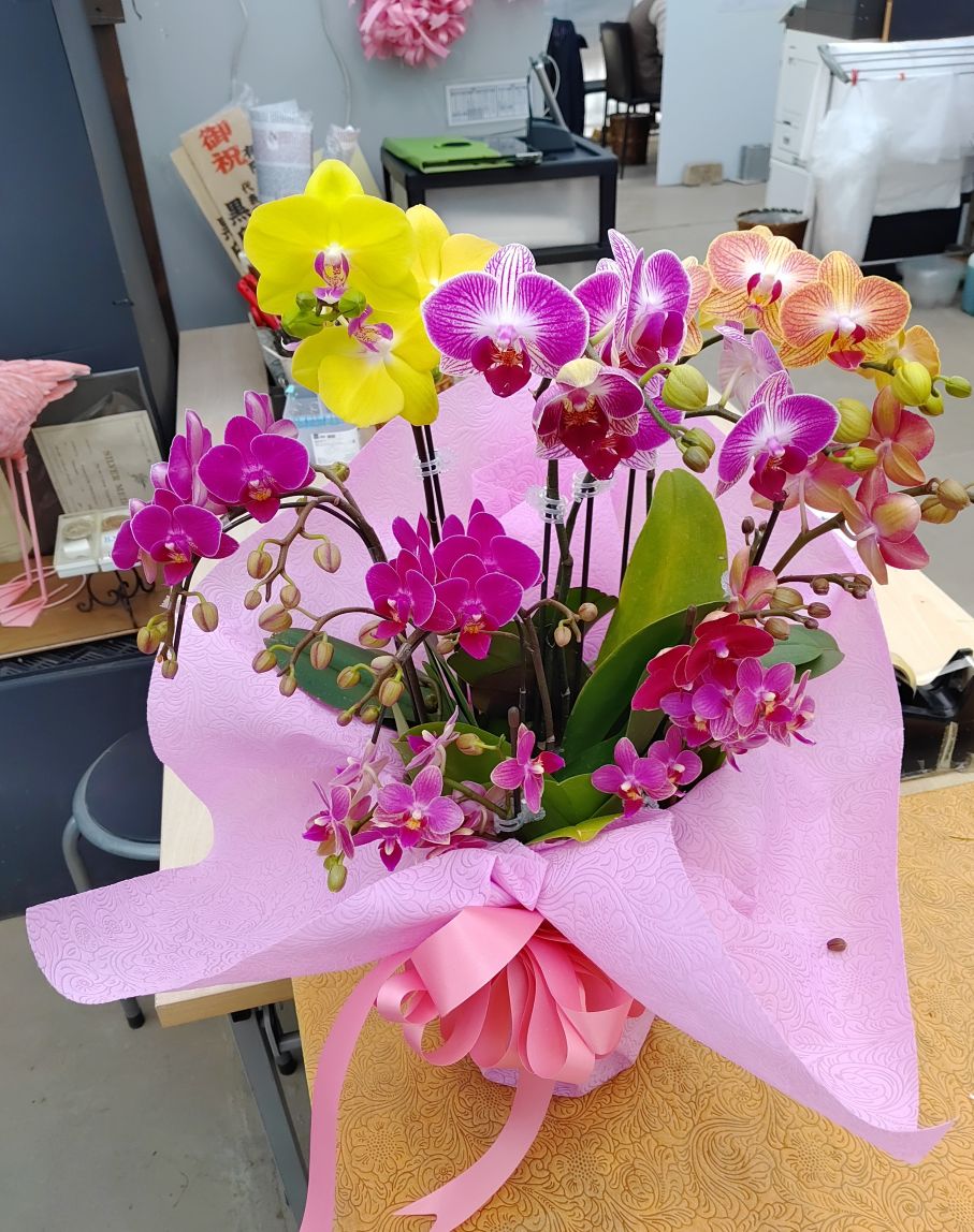 胡蝶蘭の寄せ植えを受注いたしました by Kaneko | posted in: WORKS | 0 声優の大御所・プロデューサーからミディ胡蝶蘭寄せ植えの依頼を受けました。 黒臼洋蘭園さんは寄せ植えでもグッドデザインのセンスをお持ちで、いつでも 喜ばれます。 今回は、天候不順からピンク・赤系の胡蝶蘭しか育っていなかったのですが、 うまくデザインして頂き、黄色なども足して頂きました。 つぼみも多く残っていますので、2カ月超は楽しんでもらえそうです。 その意味では、胡蝶蘭はお徳、お得な花です!